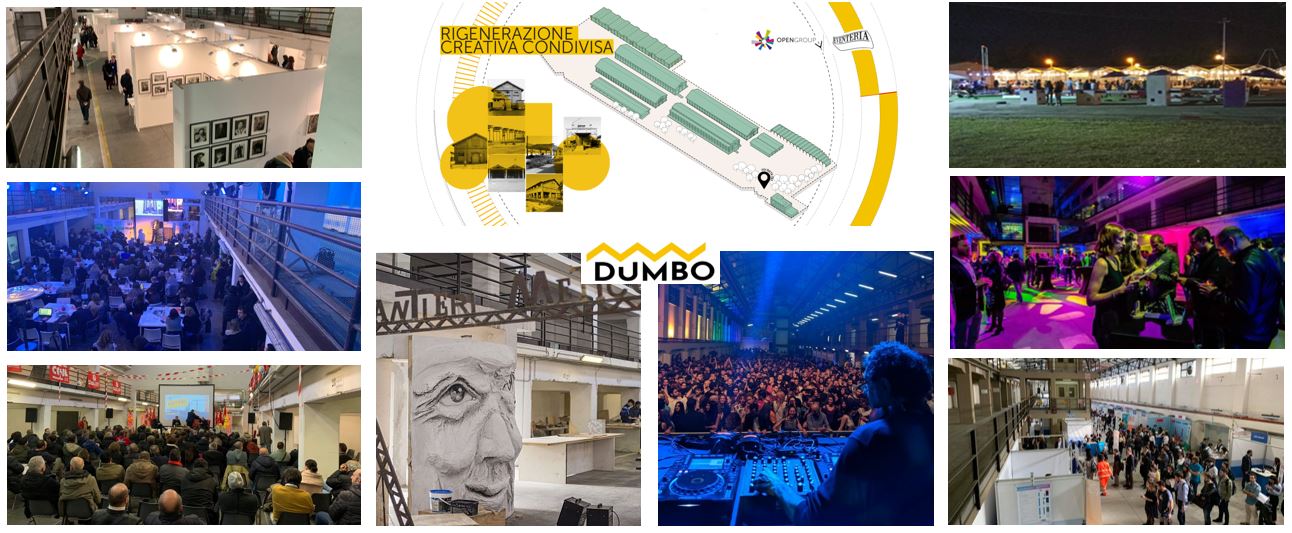 Le aree, di proprietà di FS Sistemi Urbani, società capofila del Polo Urbano del Gruppo FS Italiane, si estendono per circa 40.000 mq su cui sorgono 10 fabbricati destinati ad attività culturali, artistiche e sociali, offrendo ai cittadini luoghi di socialità e spazi per lo studio e il co-working. Solo nel 2022, più di 150mila persone hanno preso parte ad eventi organizzati da DumBo, con cui collaborano a vario titolo oltre 170 tra imprese e associazioni.