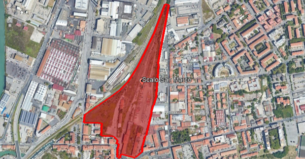 The FIa007 complex comprises the former Livorno San Marco Railway Station, one of the oldest railway stations in Italy. It consists of several buildings distributed over a total cadastral area —both covered and uncovered—of approximately 68,000 sqm. Roughly triangular in shape, the complex wedges into the northern outskirts of the city, effectively separating two distinct functional areas: the residential zone to the north-west and the industrial and port area to the south-east.